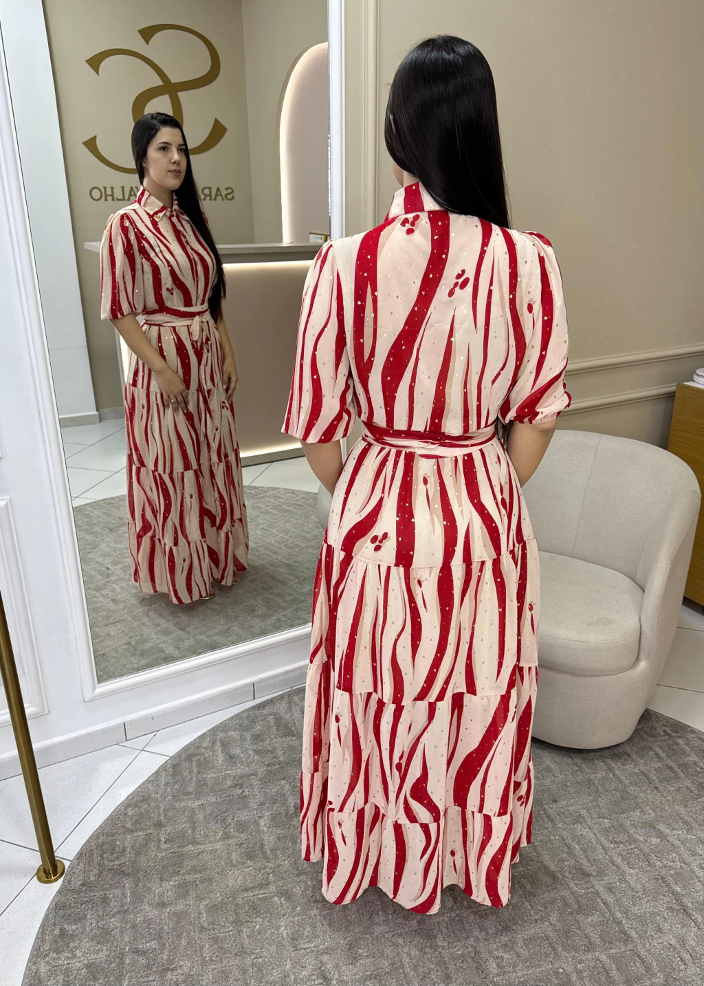 Vestido em chifon estampado, com todos os botões funcionais, elastico na cintura, manga 3/4. Acompanha uma veste e o cinto.