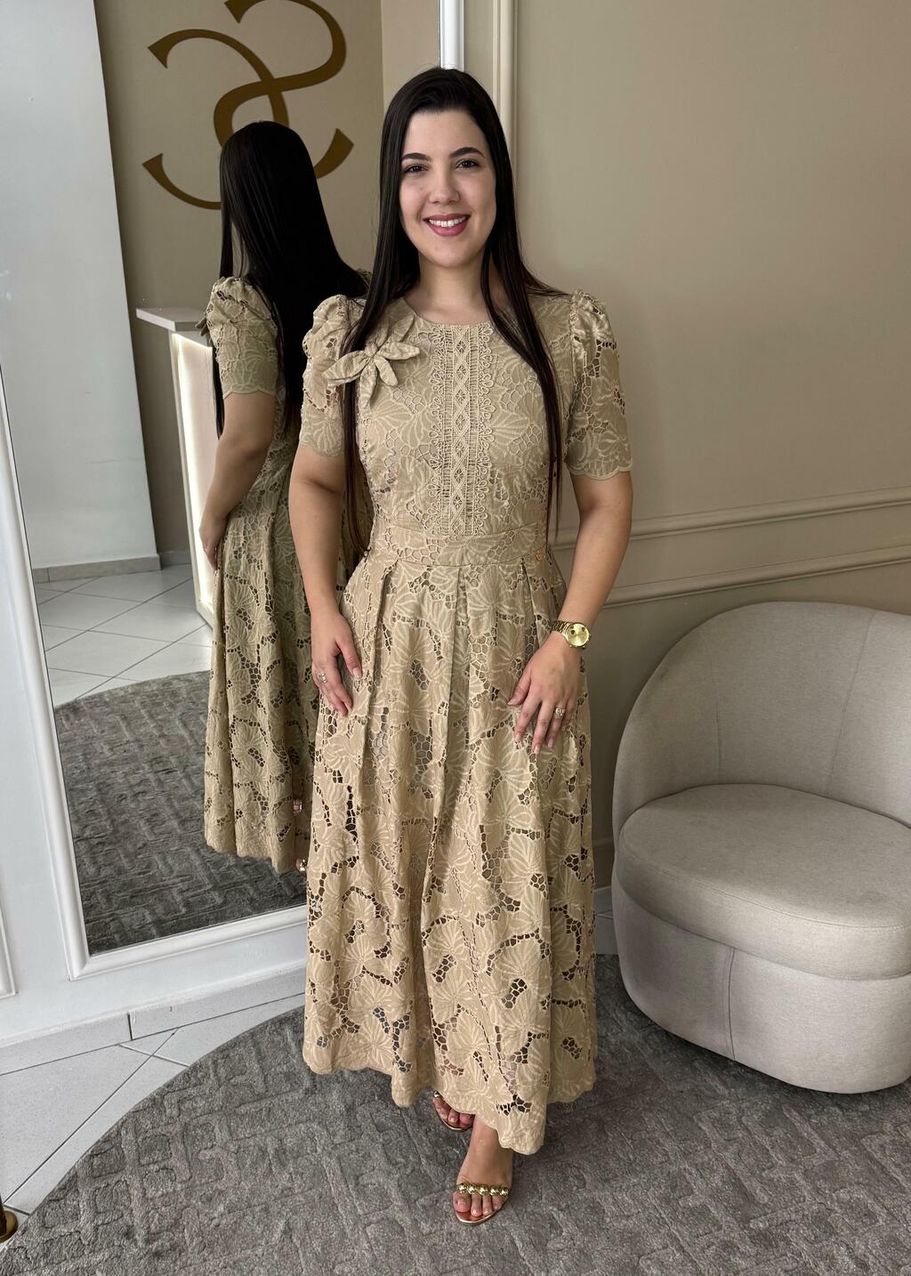 Vestido com tecido bordado, broche artesanal removivel, ziper nas costar.