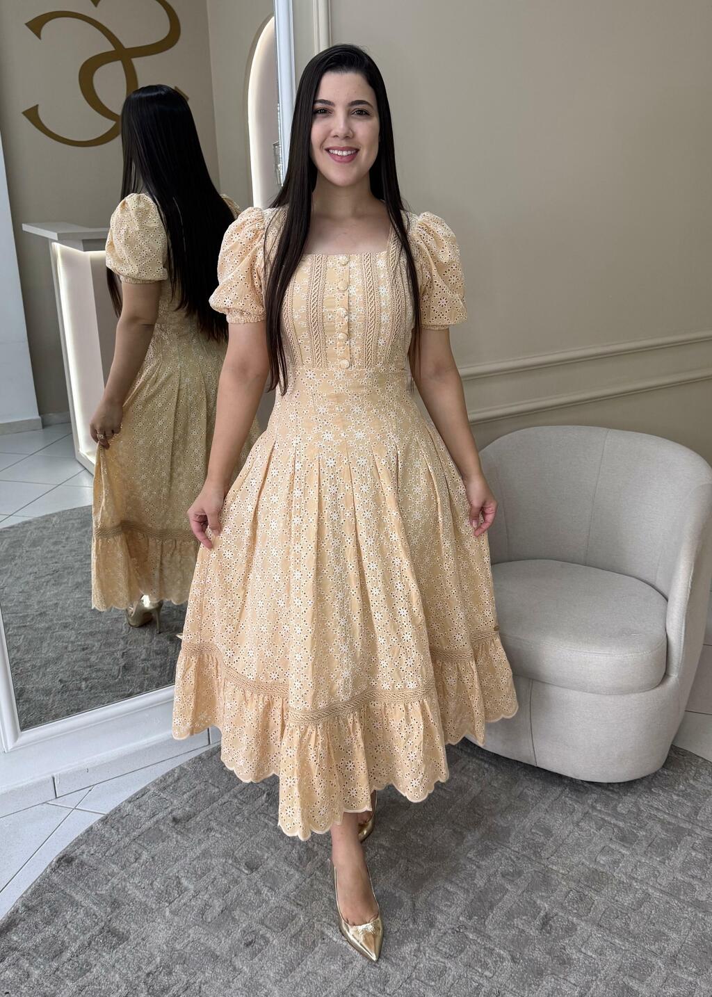 Vestido em leise bordada, forrado, com pregas na parte da saia e siper nas costas.