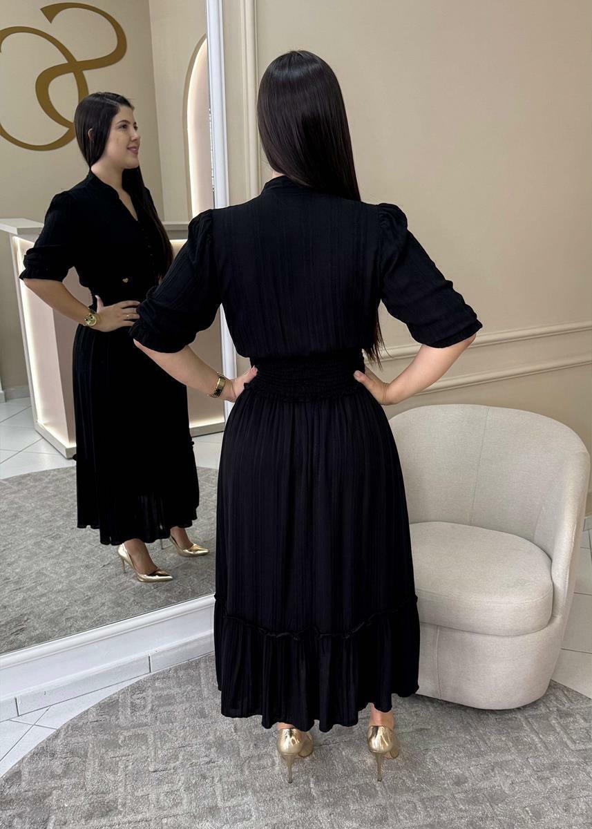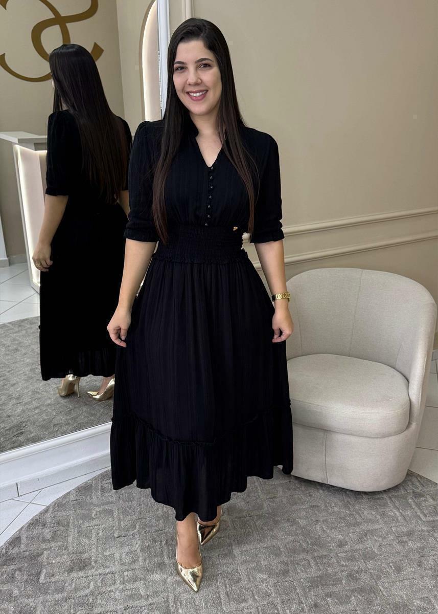 Vestido em viscose, com botões funcionais, lastex na cintura e manga 3/4.