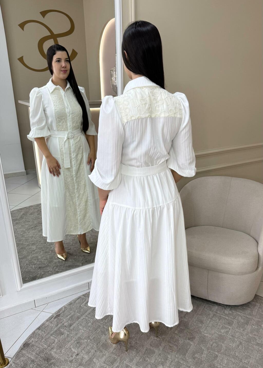 Vestido em viscose texturizada com alto relevo, manga 3/4 e botões funcionais.