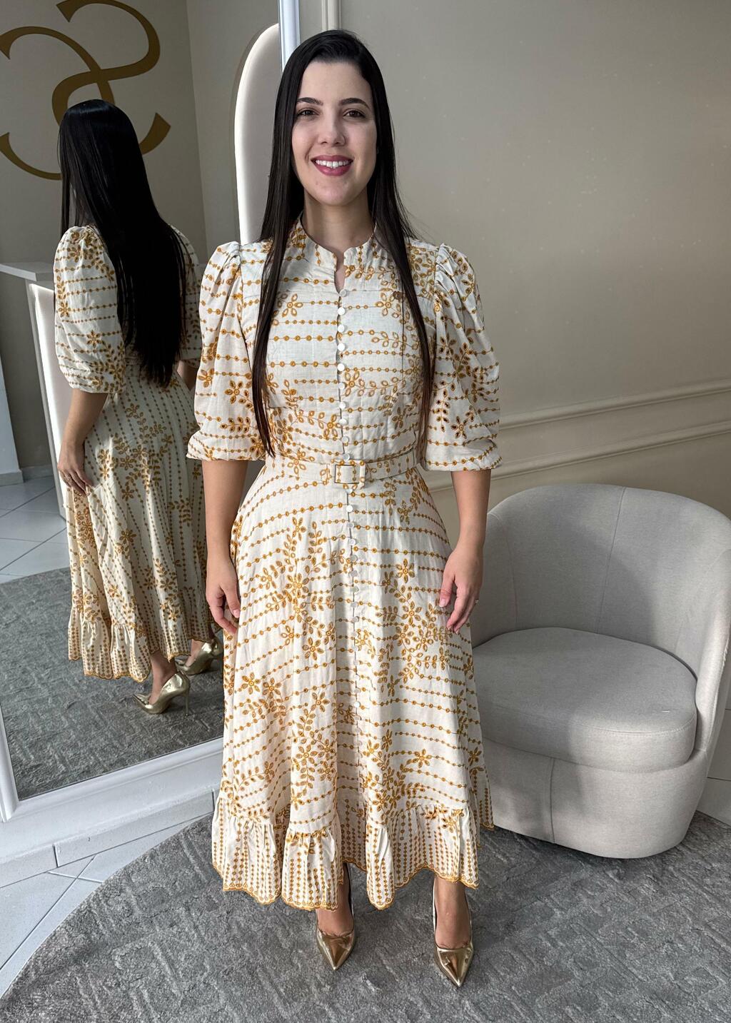 Vestido em linho bordado com viscose, todos os botões são funcionais, acompanha cinto, vestido todo forrado e manga 3/4.